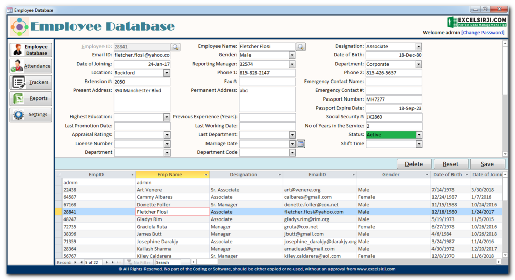 Employee Database is an MS Access based tool to manage employee details. The tool supports upto 78 demographics for each employee such as Name, Location, Phone, Email, Address etc. The tool also comes with inbuilt attendance tracker to track daily attendance of employees. Over and above this, you can also design your own trackers and start using it.