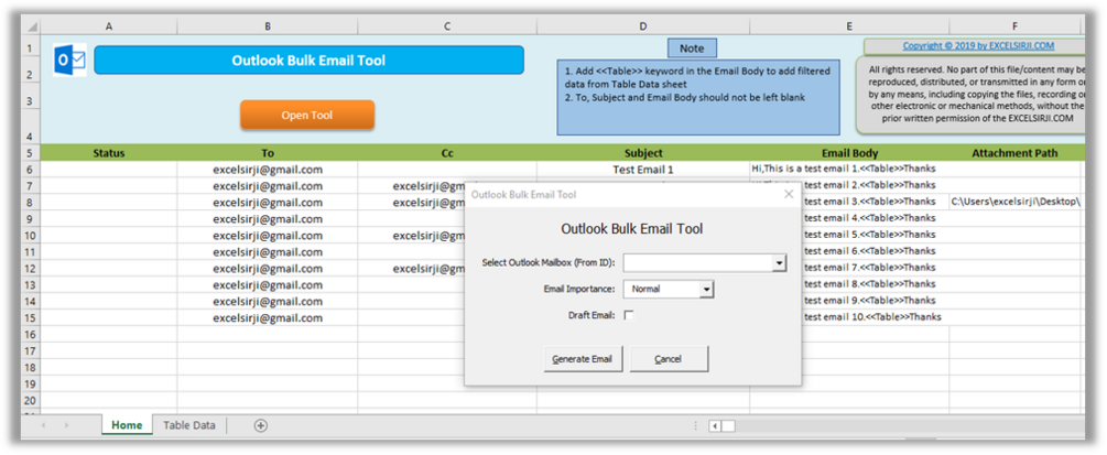 Outlook Bulk Email Tool is an Excel and Outlook based tool which helps you to send or draft email in bulk right from Excel. It reads the recipient details from Excel sheet and uses Outlook installed on your system to generate emails. The tool supports To, Cc, Subject, Email Body, Attachment, HTML Table in Email Body.